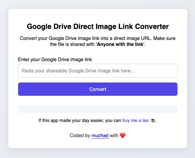 Convert your Google Drive image link into a direct image URL. Make sure the file is shared with 'Anyone with the link'.